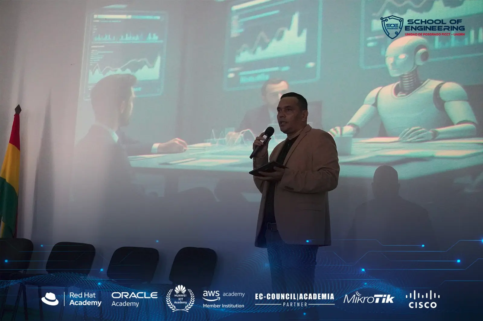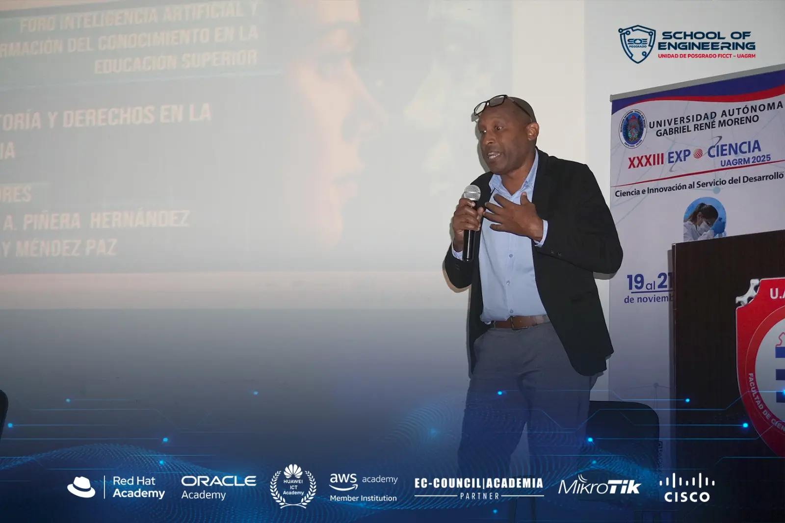 El foro contó con la intervención del M.Sc. Juan Carlos Peinado Pereira, Director de SOE, docente universitario, doctorando en ciencias de la computación e investigador. Su trabajo se centra en liderar iniciativas de investigación en inteligencia artificial, ciberseguridad, ciencia de datos y transformación digital, impulsando proyectos que articulan a docentes, estudiantes y la comunidad científica en la UAGRM; en esta oportunidad asumió el rol de moderador del panel principal. Su conducción permitió estructurar un debate orientado a comprender las implicaciones éticas, sociales y académicas derivadas del uso de tecnologías avanzadas en las universidades.
