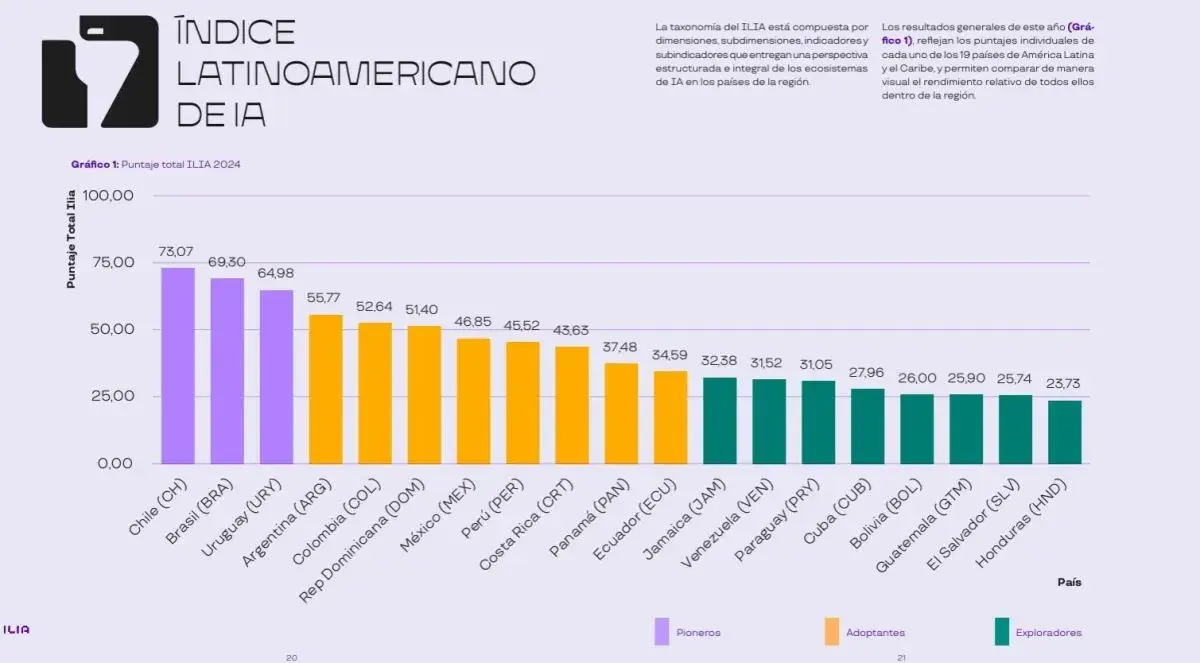 Bolivia se encuentra en una etapa exploratoria en cuanto a la adopción y desarrollo de la inteligencia artificial, clasificada como "explorador" según el Índice Latinoamericano de Inteligencia Artificial (ILIA) 2024, ocupando el puesto 16 de 19 países en la región con un puntaje de 26,00. Esto refleja un rezago significativo en comparación con países como Chile, Brasil o Uruguay, que lideran en la región. La falta de una estrategia nacional de IA, infraestructura limitada y una baja inversión en investigación son algunos de los factores que explican esta posición. Sin embargo, ciertos sectores, como el empresarial, educativo y financiero, están comenzando a experimentar con la IA, mostrando un potencial incipiente pero prometedor.